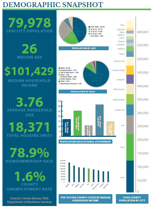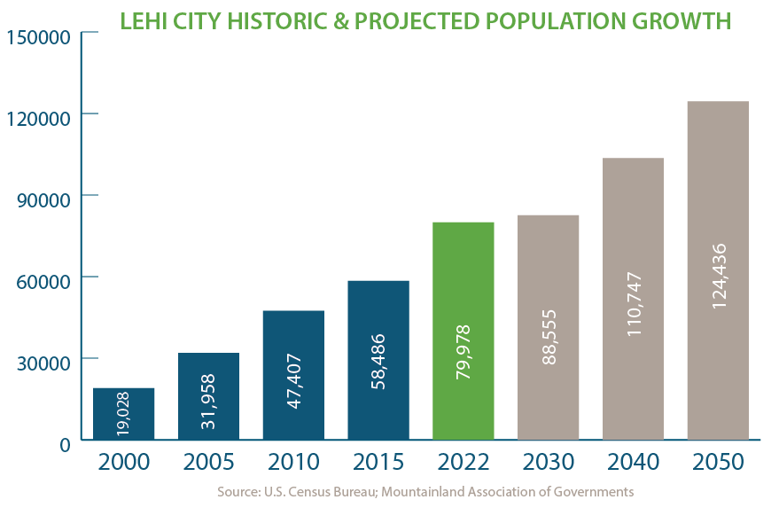 Lehi City’s population estimate as of 2022 is 79,978 from the U.S. Census Bureau. The Mountainland Association of Governments projects that by 2050, Lehi’s population will be 124,436.