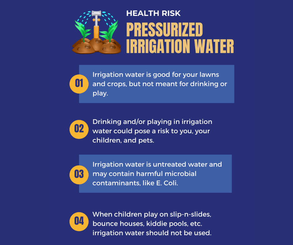 Residents should handle PI water with care and caution. Unlike the City’s culinary water system, pressurized irrigation water is not treated, making it vulnerable to contamination and harmful bacteria, such as E. Coli. Please review the following reminders from the Utah County Health Department.