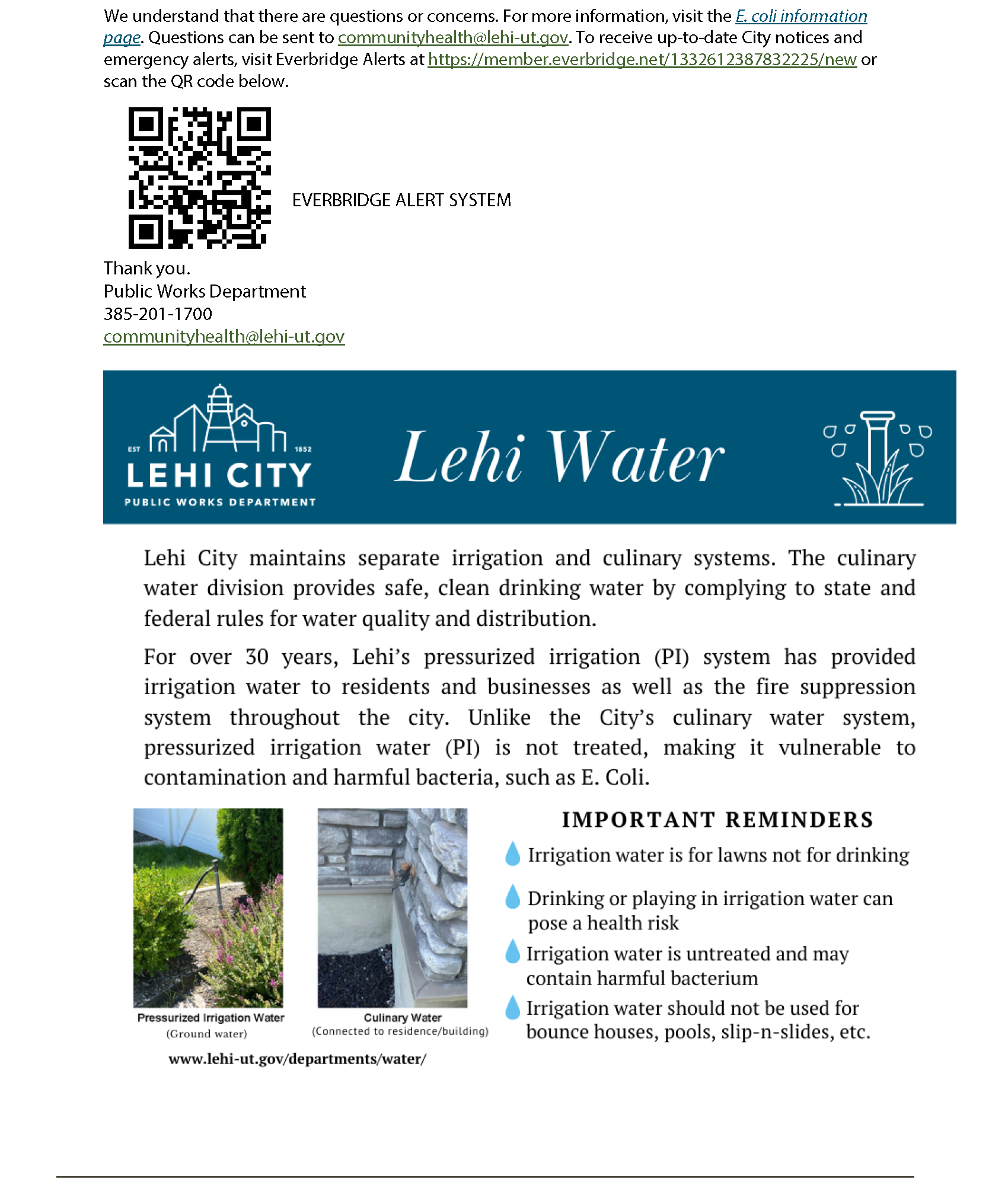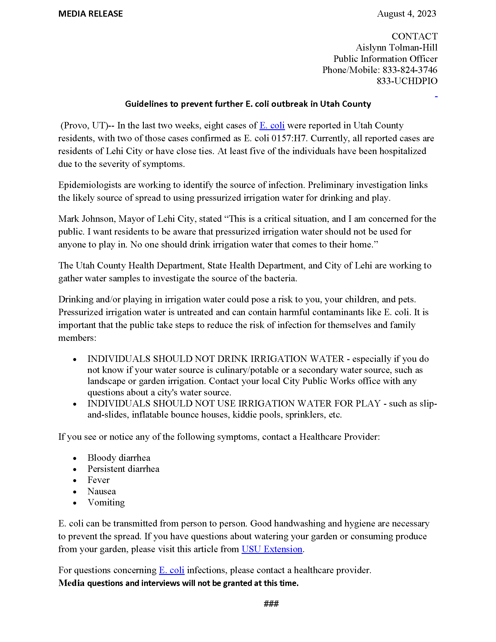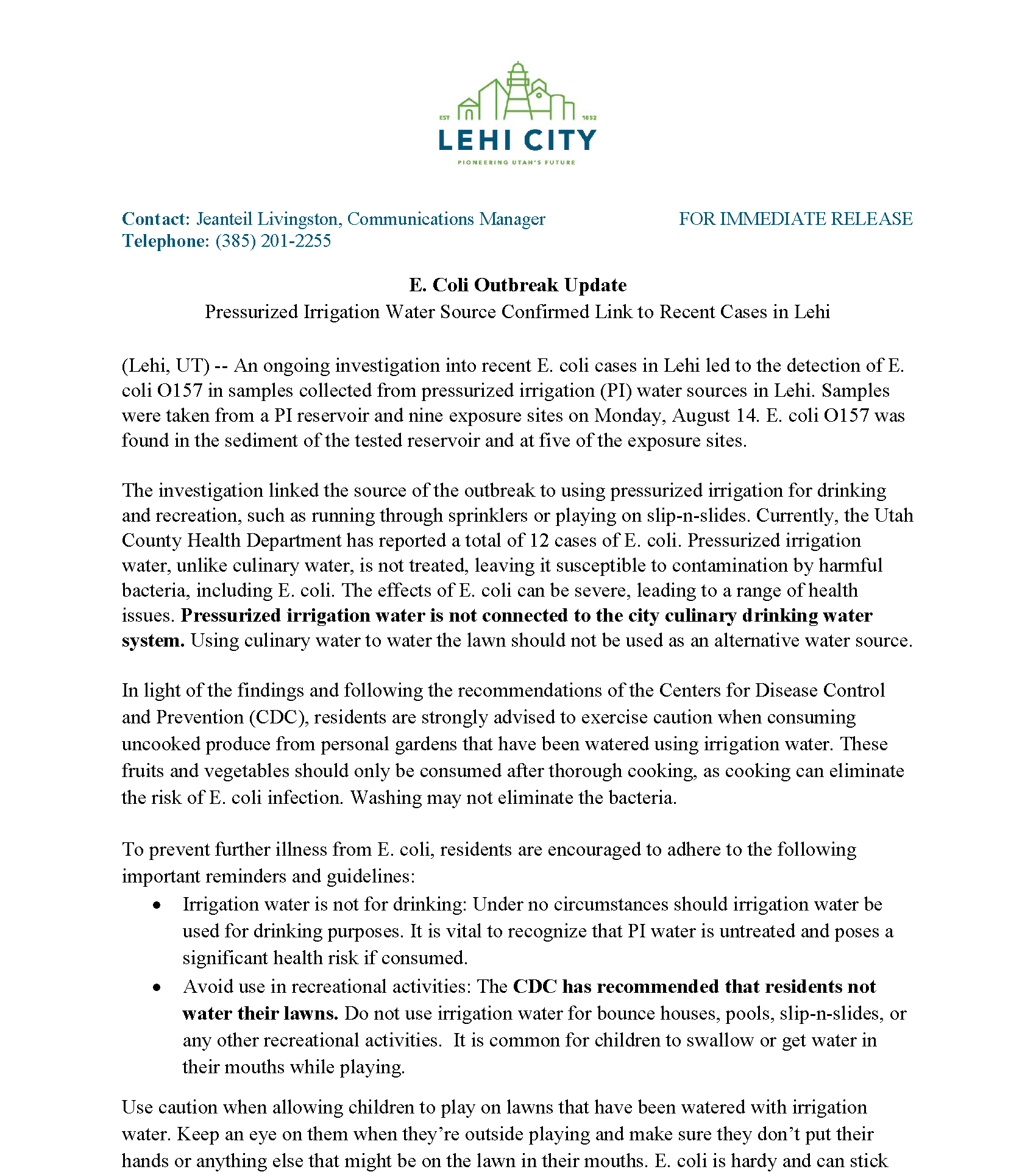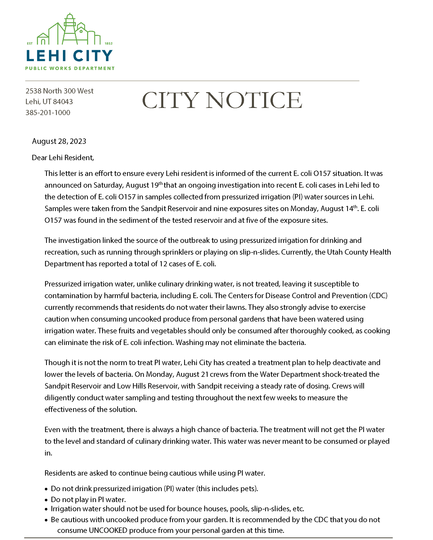 In the late summer of 2023, Utah County Health Department reported 13 cases of E. coli O157 in Lehi. The investigation linked the source of the cases to using pressurized irrigation for drinking and recreation, such as running through sprinklers or playing on slip-n-slides, bounce houses, kiddie pools, and outdoor water tables. There was no evidence that the cases came from gardening or incidental exposure such as, playing in the grass or on a play structure.