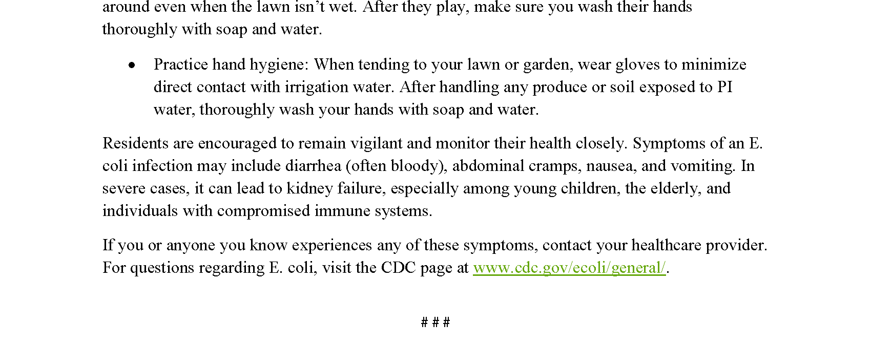 Last fall, our Water Department took the sedimentation basin of the Sandpit Reservoir out of service, cleaned it and sanitized it. Since pressurized irrigation water is not treated, there’s always a high chance of bacterium, such as E. coli, being present. This type of water was never meant to be consumed or played with. We ask residents to use caution when handling PI water because of this.
