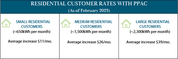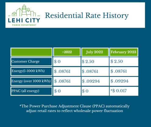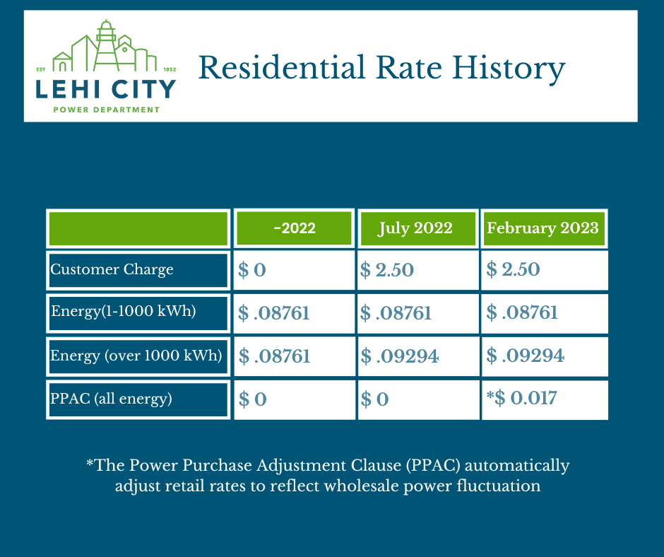 Effective February 1, 2023, Lehi City Power has implemented a purchased power adjustment clause fee (PPAC) for residents and businesses of $0.017. All energy use for residential and commercial will have the PPAC applied to their bill. In addition to the PPAC rate, residents will continue to pay the $2.50 monthly customer charge that was put in place July 1, 2022. The monthly charge will increase to $5.00 in July 2023, $7.50 the following year and then $10 a month starting July 2025. This monthly charge is used for all customer support services.