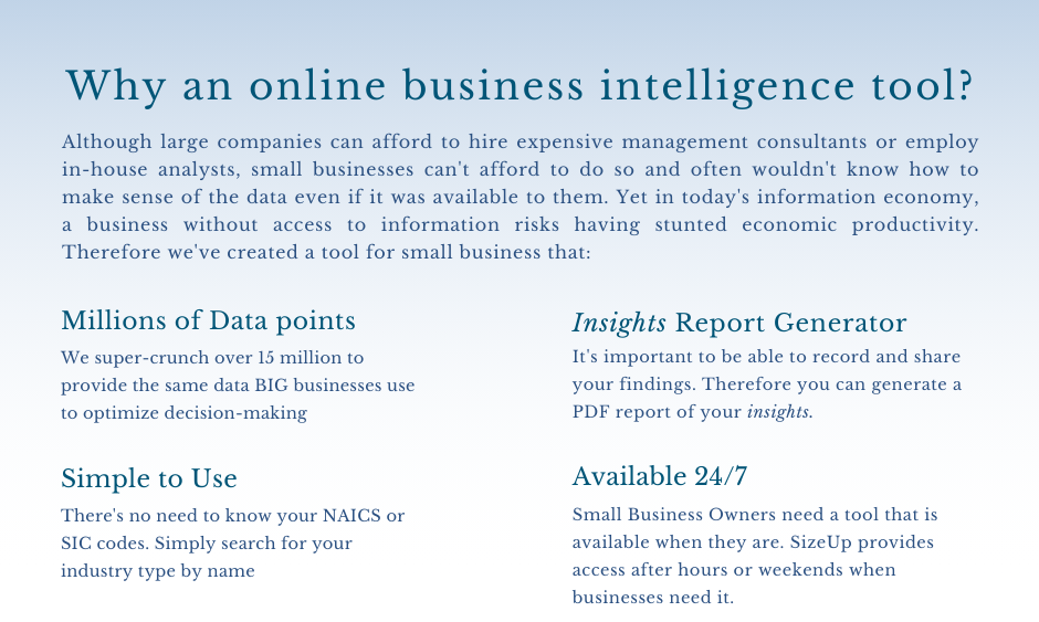 By signing up for a SizeUp account you gain access to additional competitive analysis reports and receive notices when major data updates result in a change in your business’ competitiveness and industry benchmarking. Only SizeUp members have access to additional competitiveness reports. In addition, SizeUp updates major data sets throughout the year which will result in a change in the ranked competitiveness and benchmarking of your company, so we send you an e-mail reminder that your competitiveness report has been updated so you can review the new information. Through your account you can also receive information about resources which may benefit your company or reduce your expenses. In the near future, you will be able to store multiple reports and access them through your account profile.