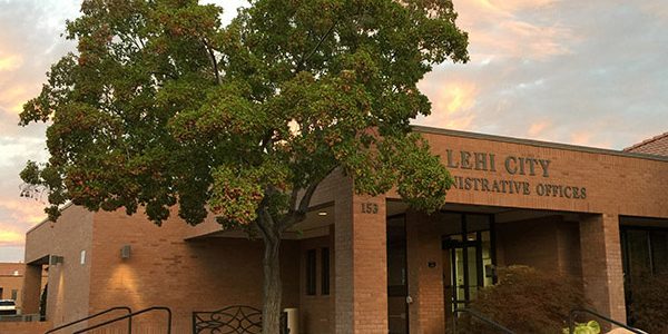 Picture of the entrance to Lehi City Hall with a colorful sunset in the background. ...