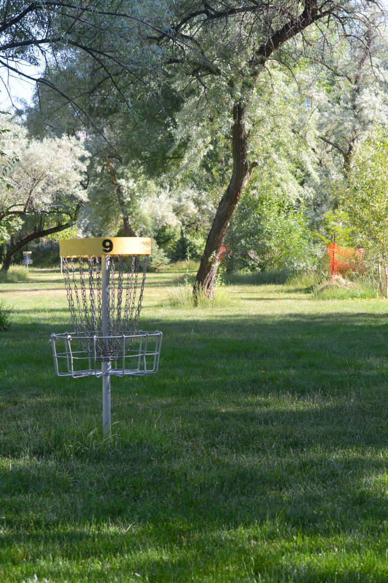 2 pavilions with 8 tables, restroom, water 15 amp power, manual lights, Frisbee golf course, fire pit, play structure, swing set, walking path.