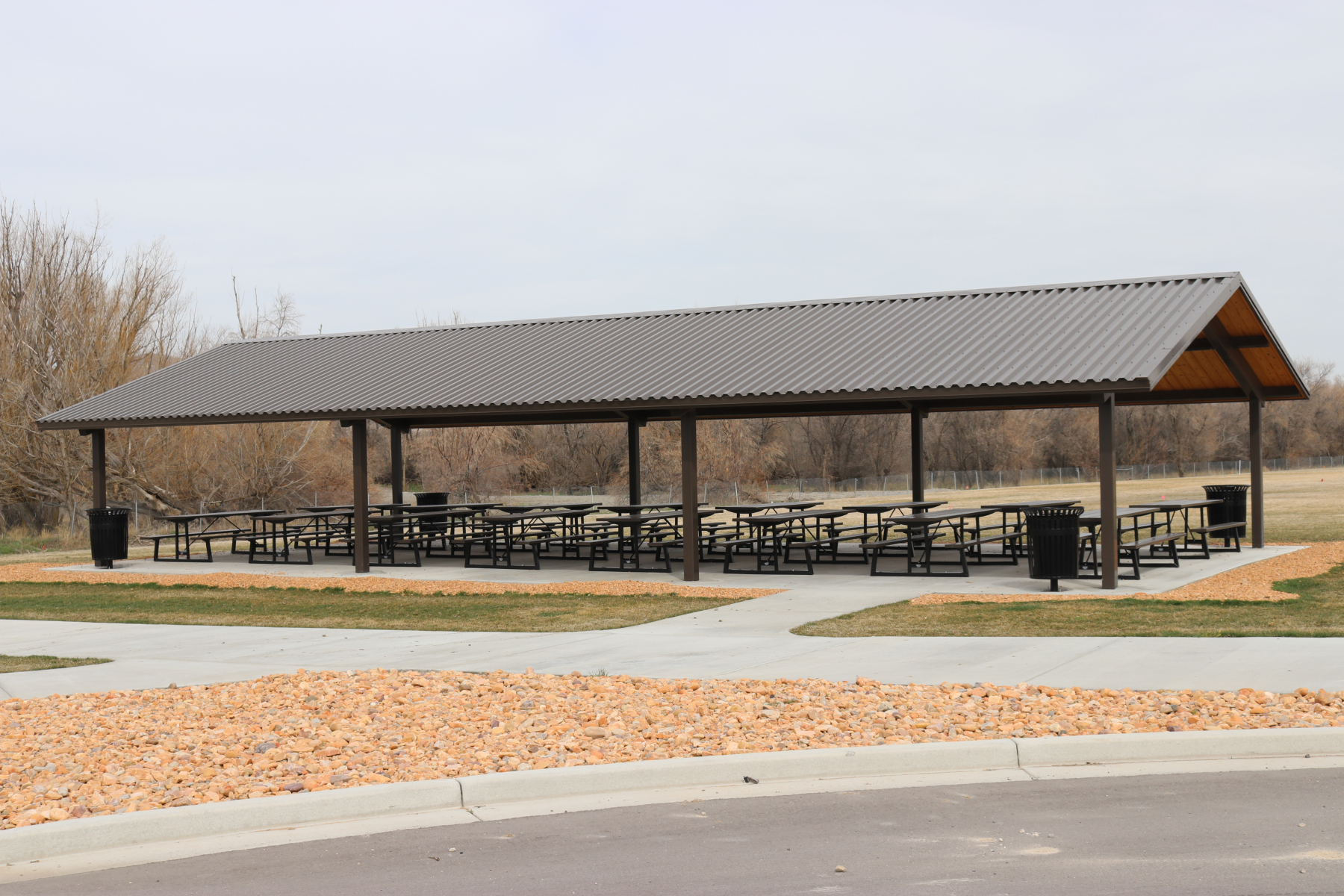 1 pavilion with 16 tables, large field area, restrooms, water, 110 amp power source.