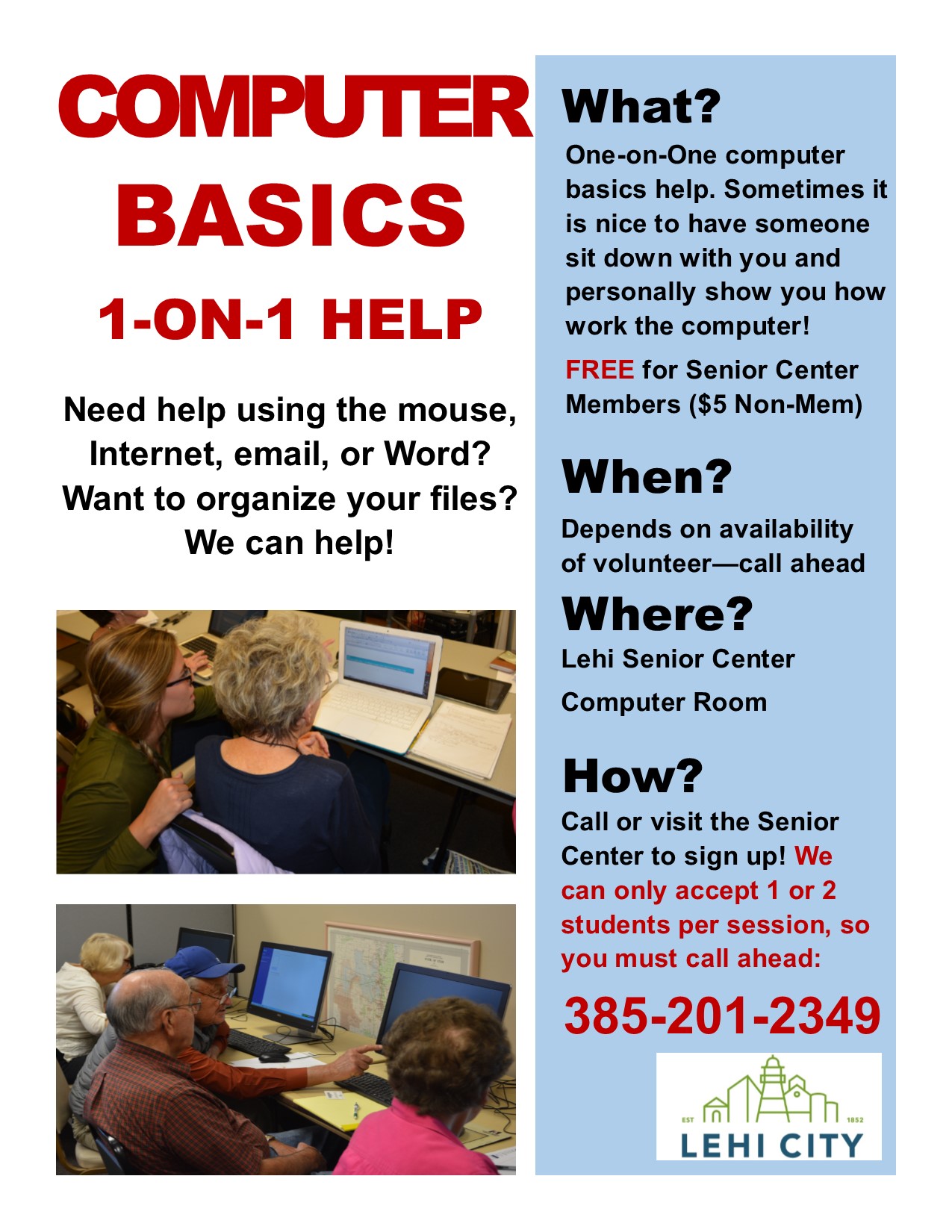 CURRENTLY ON HOLD. CHECK BACK LATER. We have awesome volunteers who will help you with computer basics, Internet, Email, Facebook, sorting your files, saving photos, you name it! We can also help with phones and iPads. Help available weekly – call for appointment. See Flier Here