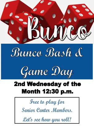 Once a month, we play BUNCO. No experience needed. This game is fun and easy to learn. We will have other games to play as well. This is free to play for Senior Center Members. See you there! See Flier Here