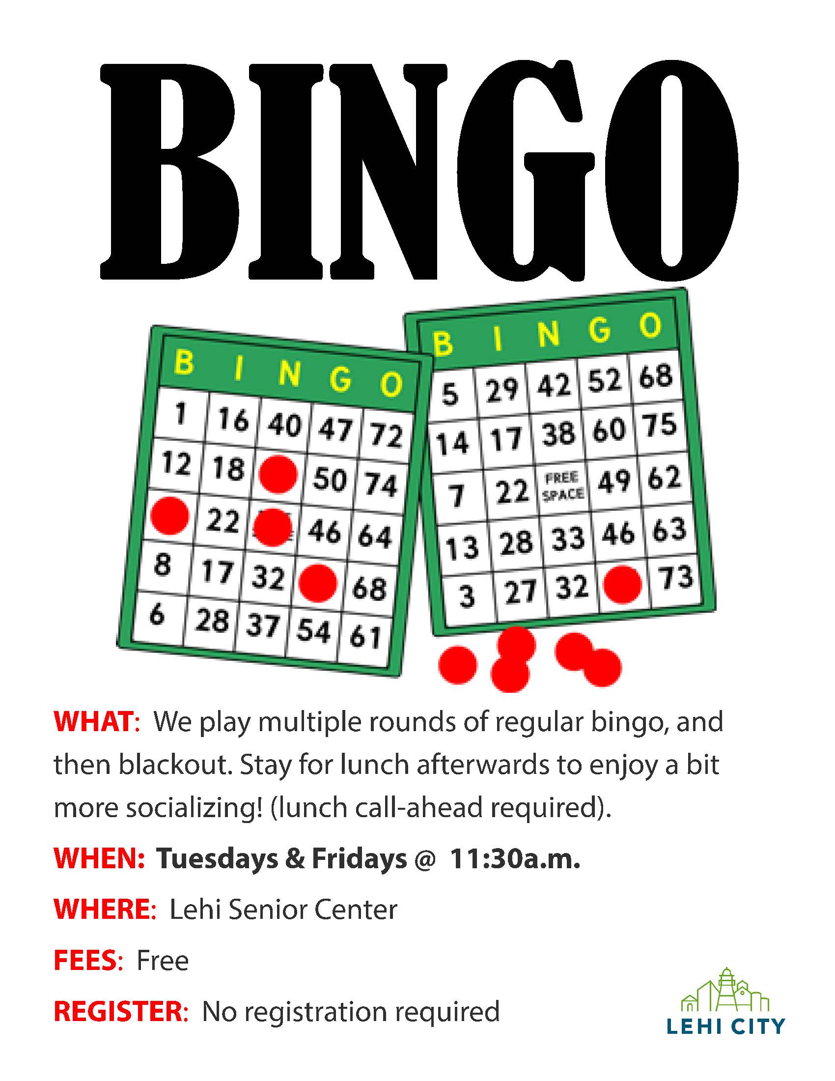 We play multiple rounds of regular bingo and then blackout. Free for Senior Center members. Tuesdays and Fridays at 11:30 a.m. Please call ahead to let us know you will be playing: 385-201-1065. Stay for lunch after bingo (lunch call-ahead required!) See Flier Here