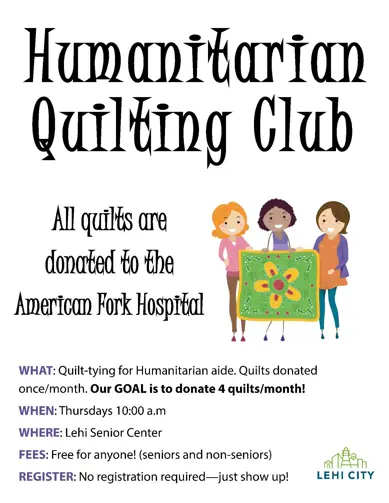 CURRANTLY ON HOLD. Enjoy socializing with friends while serving your community! All quilts donated to local refugees or the American Fork Hospital. Quilts are pieced together and sewn by senior volunteers outside of club time. Free for members. Thursdays at 10:00 a.m. No registration required. See Flier Here
