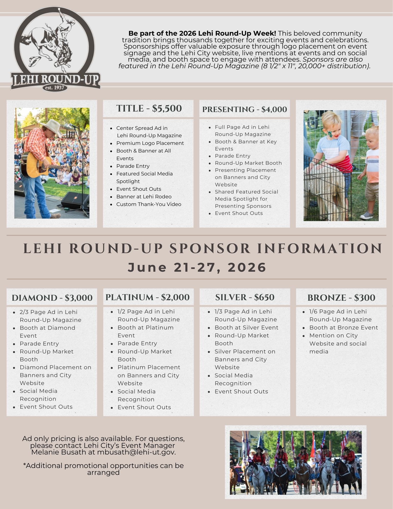 As a Lehi Round-Up sponsor, your business connects with nearly 20,000 residents and visitors during one of Lehi’s most anticipated week-long celebrations. From concerts and parades to family events and long-standing traditions, sponsorship is a great way to support the community while gaining meaningful visibility.